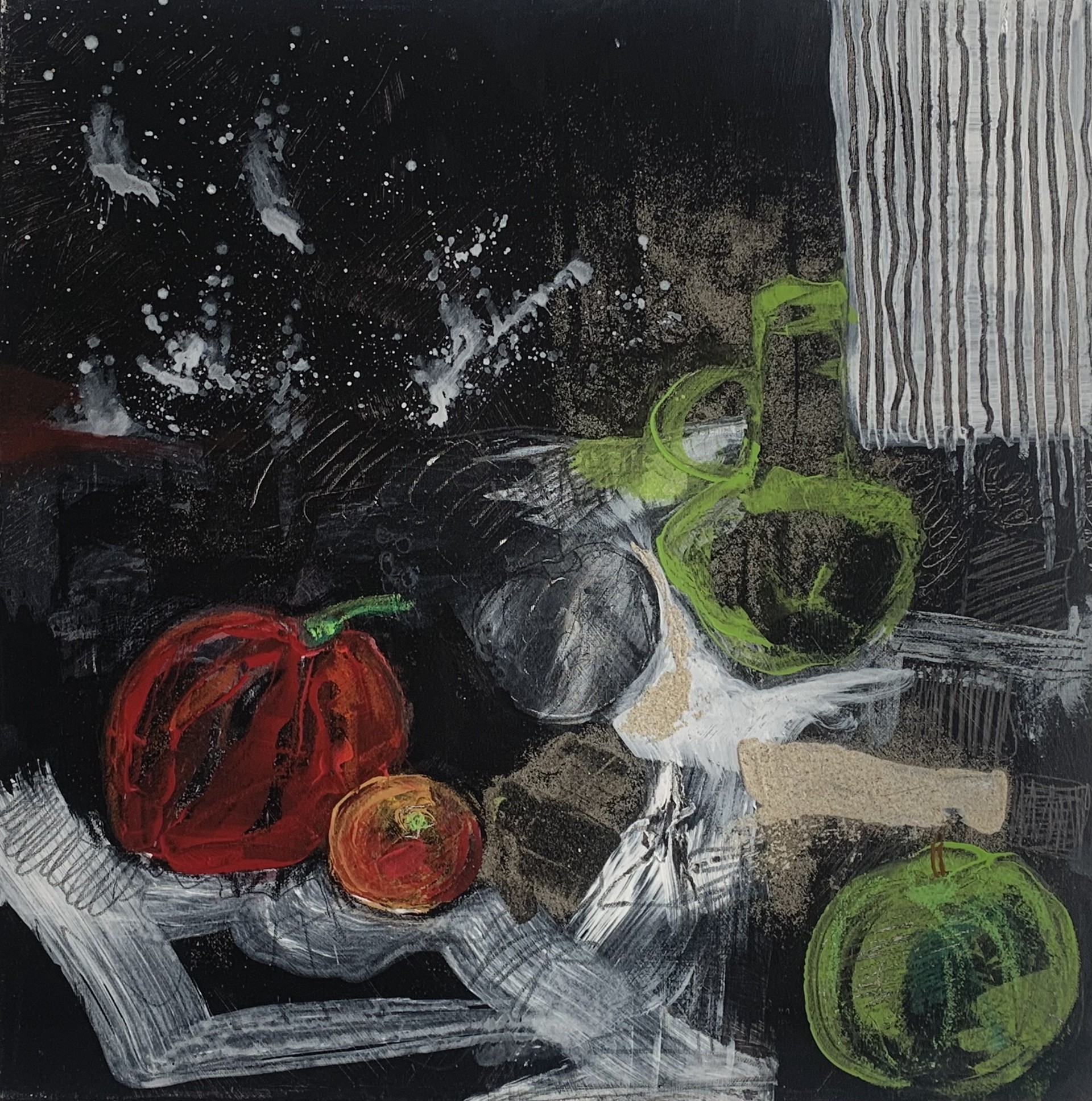 Carmen Grau, Paprika, Tomate 2021 acryl-sand auf Leinwand 50×50 300,-€ (1)